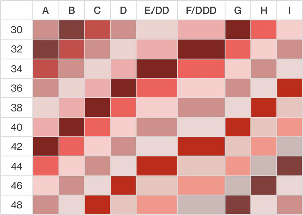 Bra sizes that share the same color are "sister sizes" – an equivalent size that contains the same cup volume (even if it's a different letter). Need to go down a band size? Follow the same color across the chart to the smaller band size and you'll find the cup you need. If you want to go up a band size, you need to go down one cup size. Band size increases from top to bottom. Cup size increases from left to right on the chart.